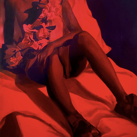 Two figures are in embrace with one depicted in a warm bright almost cautionary red, while the other blends into the blue cool toned background. They are located next to the corner of a bed with the sheets filled down the side and a ring necklace lays on the mattress. The areas where the transparent figure touches the red figure is blue, while the red figure is not touching anything with his hands.